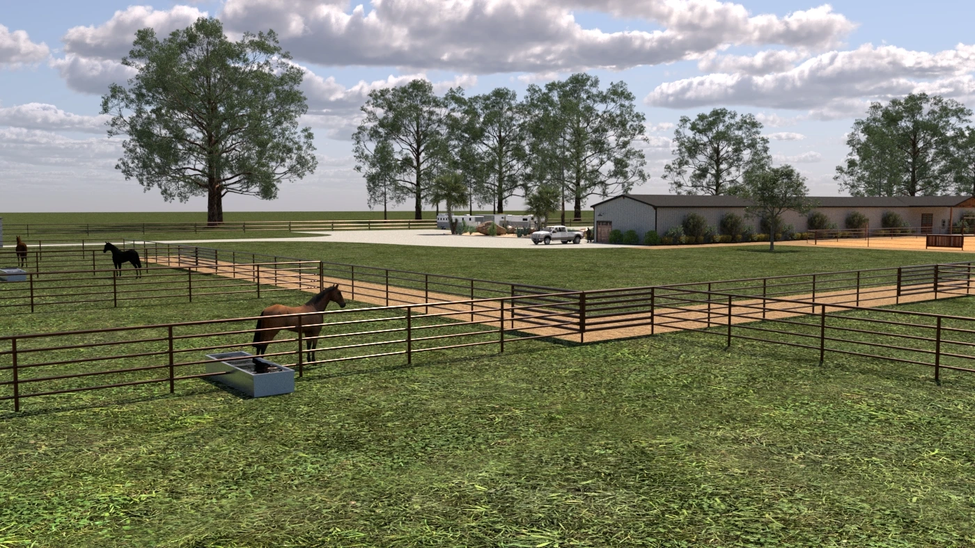 The 20 stall barn is thoughtfully designed to provide comfort, convenience, and safety. Each spacious 12' x 20' stall is sand-filled for optimal comfort and cleanliness, eliminating the need for shavings. An automatic fly-spray misting system and strategically placed fans help maintain a cool, pest-free atmosphere year-round. All stalls are also equipped with timed lighting to help maintain a sleek, show-ready coat.